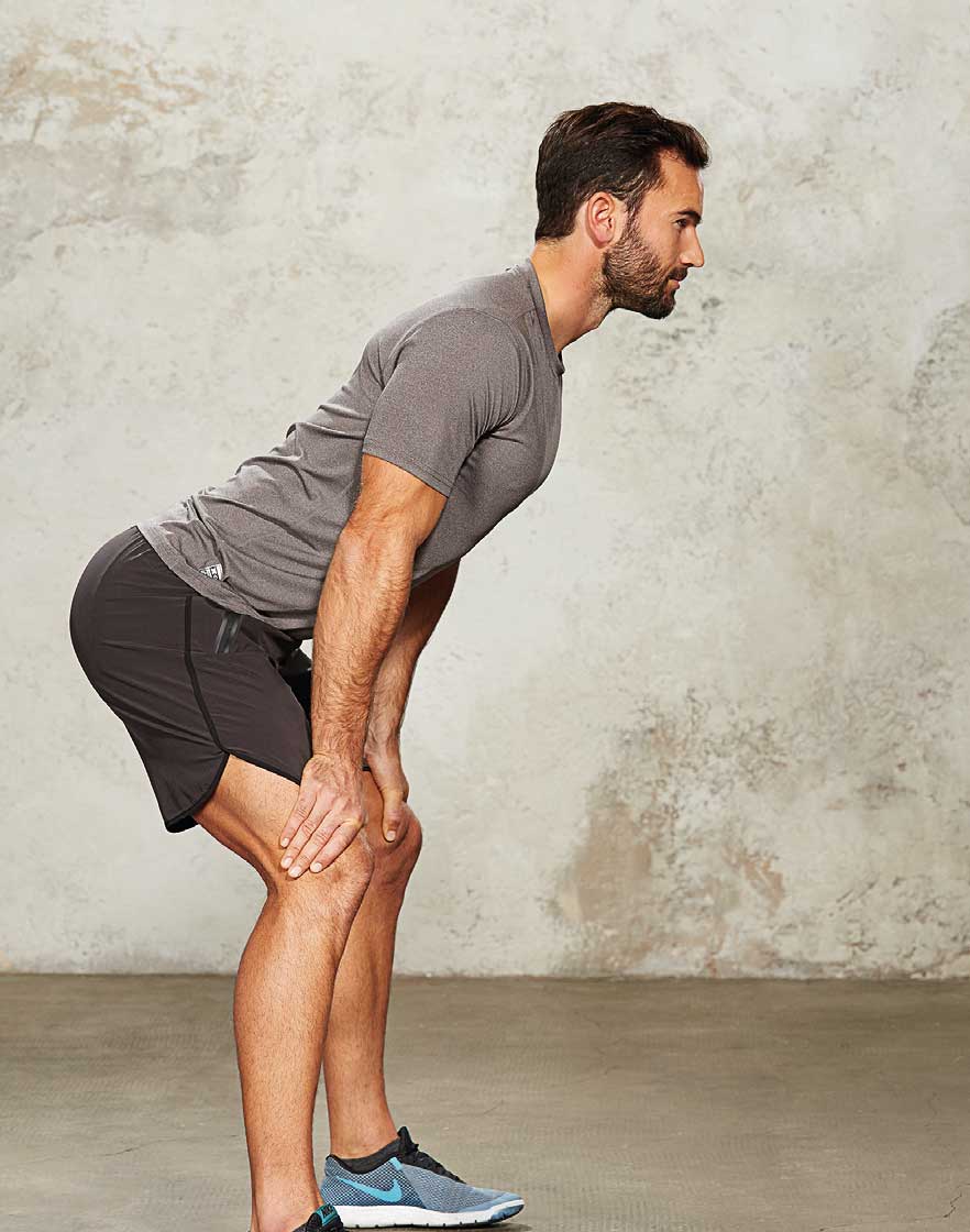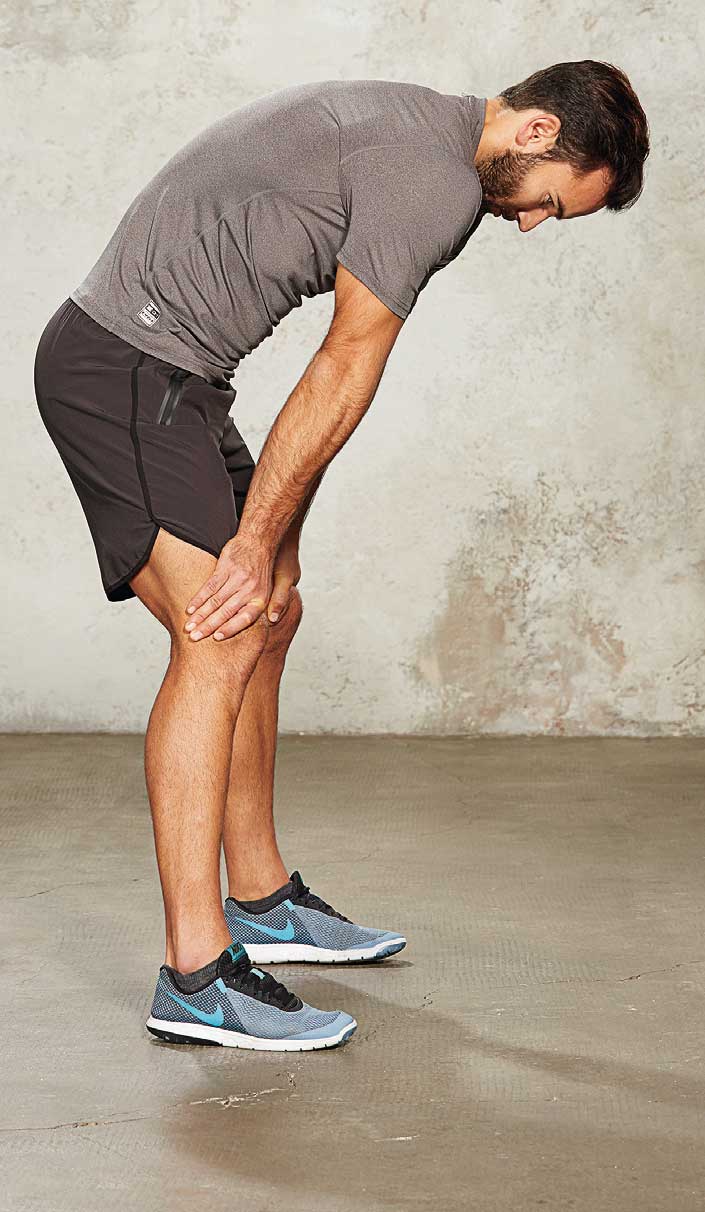 • Übung 2: Mobilisation der Wirbelsäule Wirkung: Eine wohltuende Aktivierung von Rückenmuskulatur und Schultergürtel. • Stehen Sie in weiter Grätsche und stützen Sie sich mit nach außen rotierten Händen auf den Oberschenkeln ab. Die Knie sind gebeugt, der Oberkörper leicht nach vorn geneigt. Der Rücken ist gerade. • Mit dem Ausatmen den Rücken Wirbel für Wirbel langsam zum Katzenbuckel beugen, am Steißbein beginnend und am Scheitel endend. Die Schulterblätter bewegen sich dabei auseinander. • Dann senken Sie den Brustkorb einatmend so weit wie möglich. • Lassen Sie die Bewegungen sanft ineinander übergehen und nehmen Sie bewusst wahr, wie sich die Position jedes Wirbels verändert. Schwerer: Nehmen Sie sich Zeit für die Übung. Führen Sie die Bewegung betont langsam aus. Halten Sie jeweils die Endposition für einige Sekunden, dann mit der Gegenbewegung fortfahren.