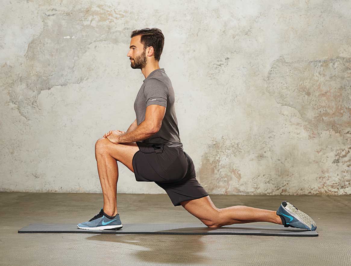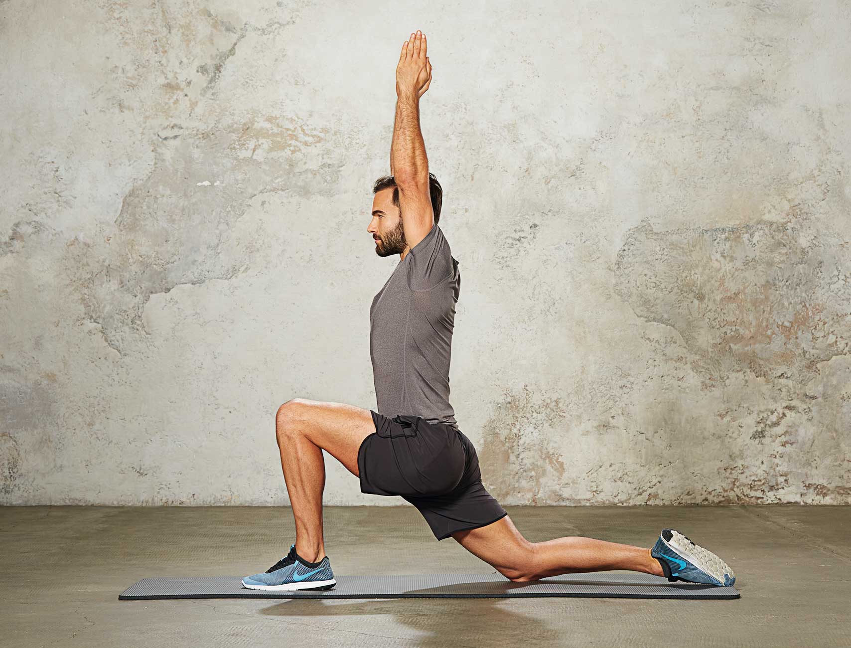 • Übung 4: Aufgehender Mond Wirkung: Dehnt auf sanfte Weise Ihre Hüftbeugemuskulatur und das Gesäß. Gleichzeitig wird der Rücken aufgerichtet und entlastet. • Aus dem Vierfüßlerstand machen Sie mit dem linken Fuß einen Schritt nach vorn – so weit, dass sich der Unterschenkel senkrecht über dem Sprunggelenk befindet. • Stützen Sie sich mit beiden Armen auf dem linken Oberschenkel ab. Richten Sie den Oberkörper auf und lassen Sie gleichzeitig die Hüften in Richtung Boden sinken. • Dann führen Sie die Arme seitlich über den Kopf. Strecken Sie Arme und Fingerspitzen aktiv nach oben, ohne die Schultern mit nach oben zu bewegen. • Einige Atemzüge in dieser Position verharren, dann die Arme langsam seitlich absenken, um langsam zurück in den Vierfüßlerstand zu kommen. • Anschließend die Seite wechseln. Schwerer: Streben Sie mit den Fingerspitzen zum Himmel. Bauen Sie bewusst Spannung auf, dann werden Ihre Muskeln effektiv in der ganzen Länge gedehnt.