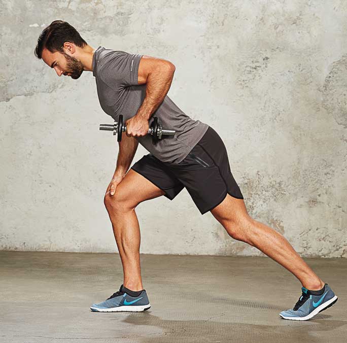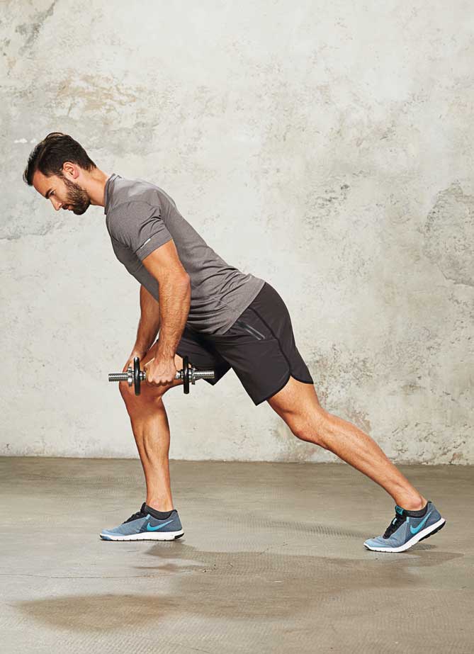 • Übung 5: Einarmiges Rudern Wirkung: Kräftigung der Muskeln des oberen Rückens, der Schultern und des Nackens. So wird die aufrechte Haltung unterstützt. • Gehen Sie in einen Ausfallschritt und stützen Sie sich mit einer Hand auf dem vorderen Bein ab, wobei der Oberkörper leicht vorgebeugt ist und somit die Hand unterhalb der Schulter liegt. Der Arm ist nicht durchgedrückt. • Der Rücken bleibt gerade, der Bauch ist angespannt. Halten Sie den Kopf in einer Linie mit der Wirbelsäule. In der herabhängenden Hand halten Sie eine Hantel, wobei die Handinnenfläche zum Körper zeigt. Der Ellbogen ist leicht angewinkelt. • Ziehen Sie das Gewicht ausatmend in gleichmäßigem Tempo nahe am Körper entlang nach oben, bis sich die Hand auf Höhe der unteren Rippen befindet. Halten Sie die Ellbogen dabei dicht am Körper und achten Sie darauf, dass das Gewicht die Schultern nicht nach unten zieht. • Erst eine Seite konzentriert trainieren, dann Hand und Schrittstellung wechseln und die Übung wiederholen. Schwerer: Verbessern Sie weiter Ihr Körpergefühl! Ziehen Sie zunächst die Schulter nach oben, dann erst wird das Gewicht mit dem Arm zum Körper hochgezogen.